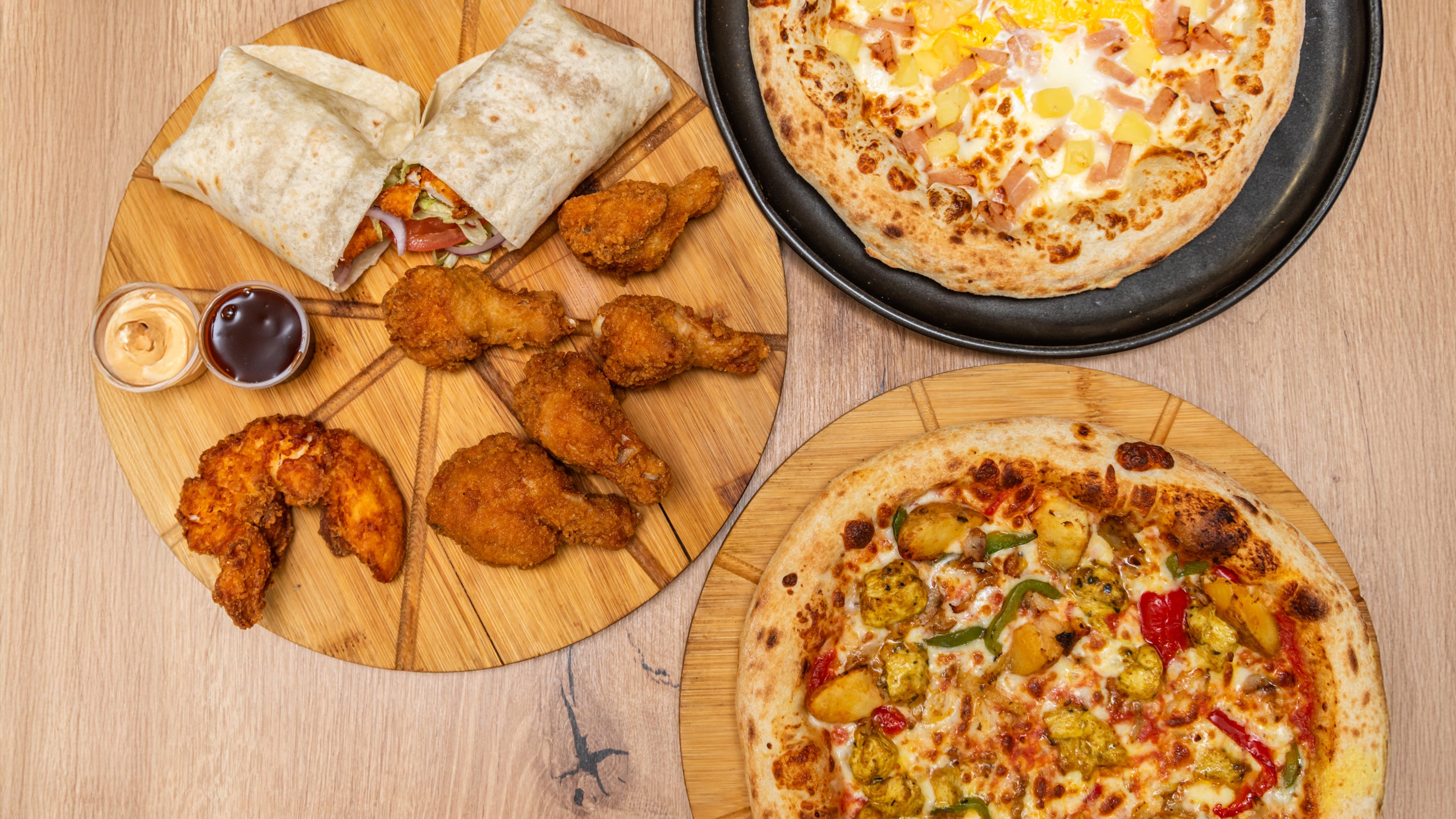 Base tomate, mozzarella, poulet fumé, pomme de terre, oignons€11.50Cap Bon