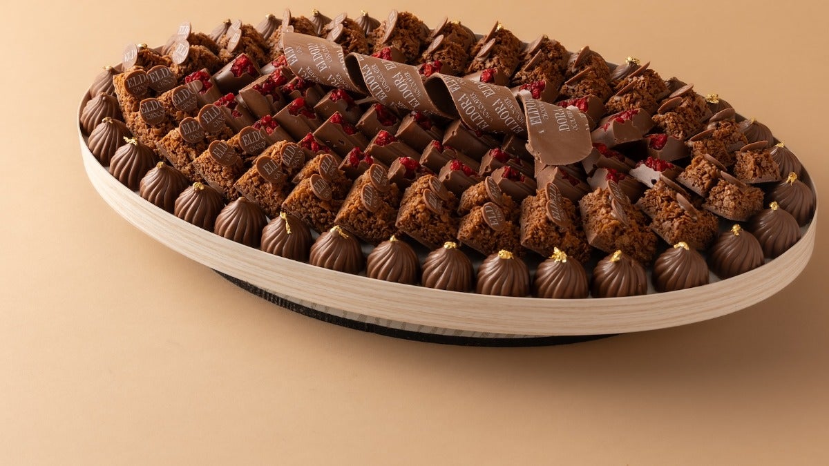 A specially designed wooden tray filled with 1 kg of chocolate with pistachio, pecan, nut cookies, and kinder cinnamon fillings.KD 27.000