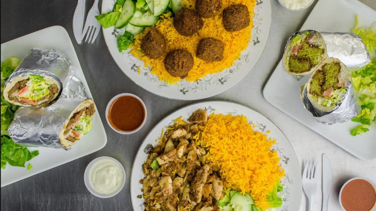 Escalope marinée, tenders, galette de pdt, poivrons et oignons confits, sauces algérienne et brazil.